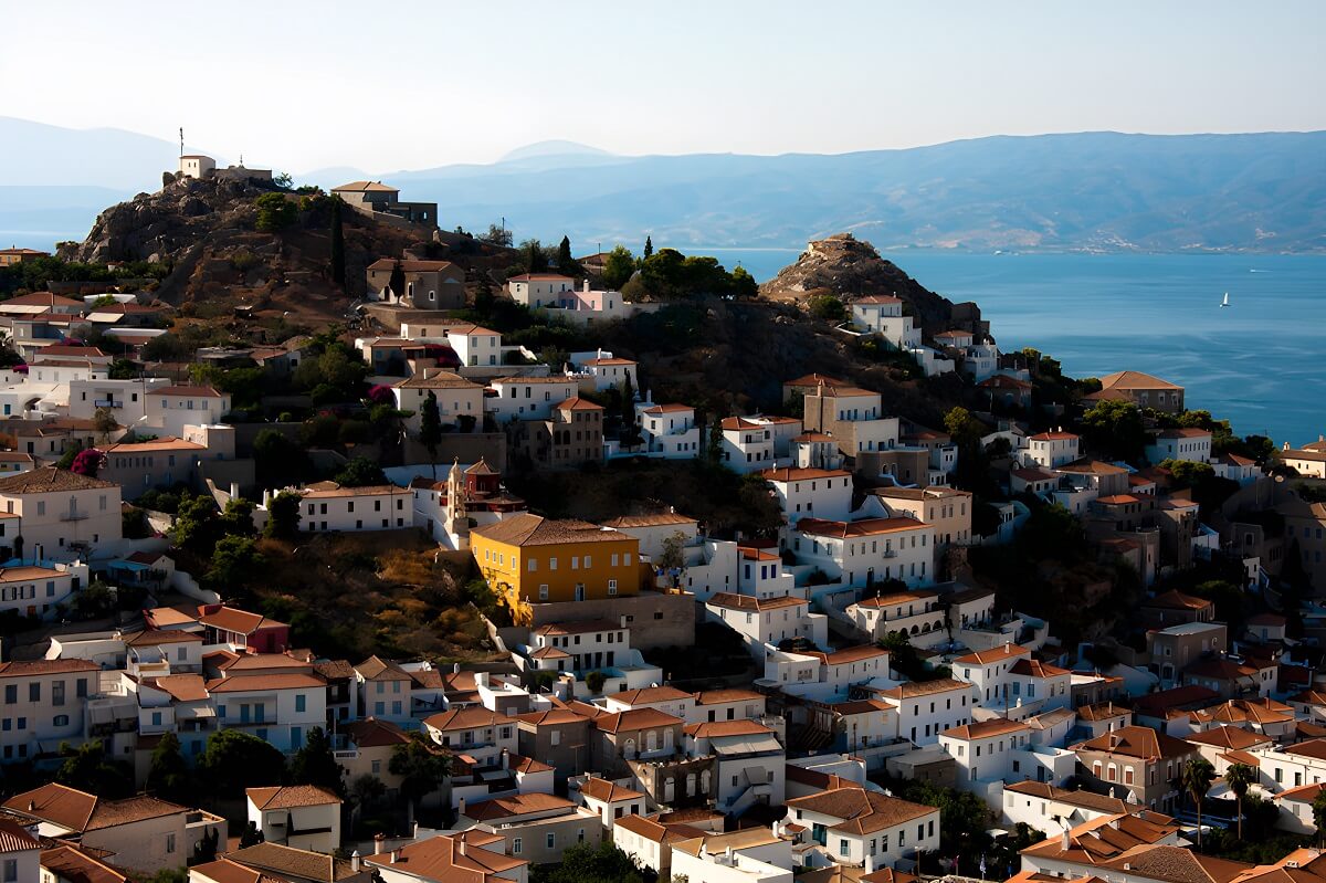 Häuser, die majestätisch von den Hängen der Insel Hydra herabfallen