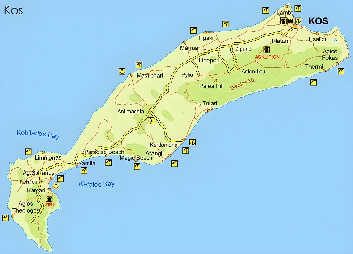 Kos ist die griechische Insel, die dem türkischen Bodrum am nächsten liegt. Sie gehört zur Inselgruppe der Dodekanes (bedeutet “zwölf”). Die Fläche der Insel beträgt 290 km², der größte Teil ist flach, nur im Osten der Insel gibt es kleine Berge mit den Namen Dikeos (846 m), Simpiros (428 m) und der Hügel Latra (416 m).