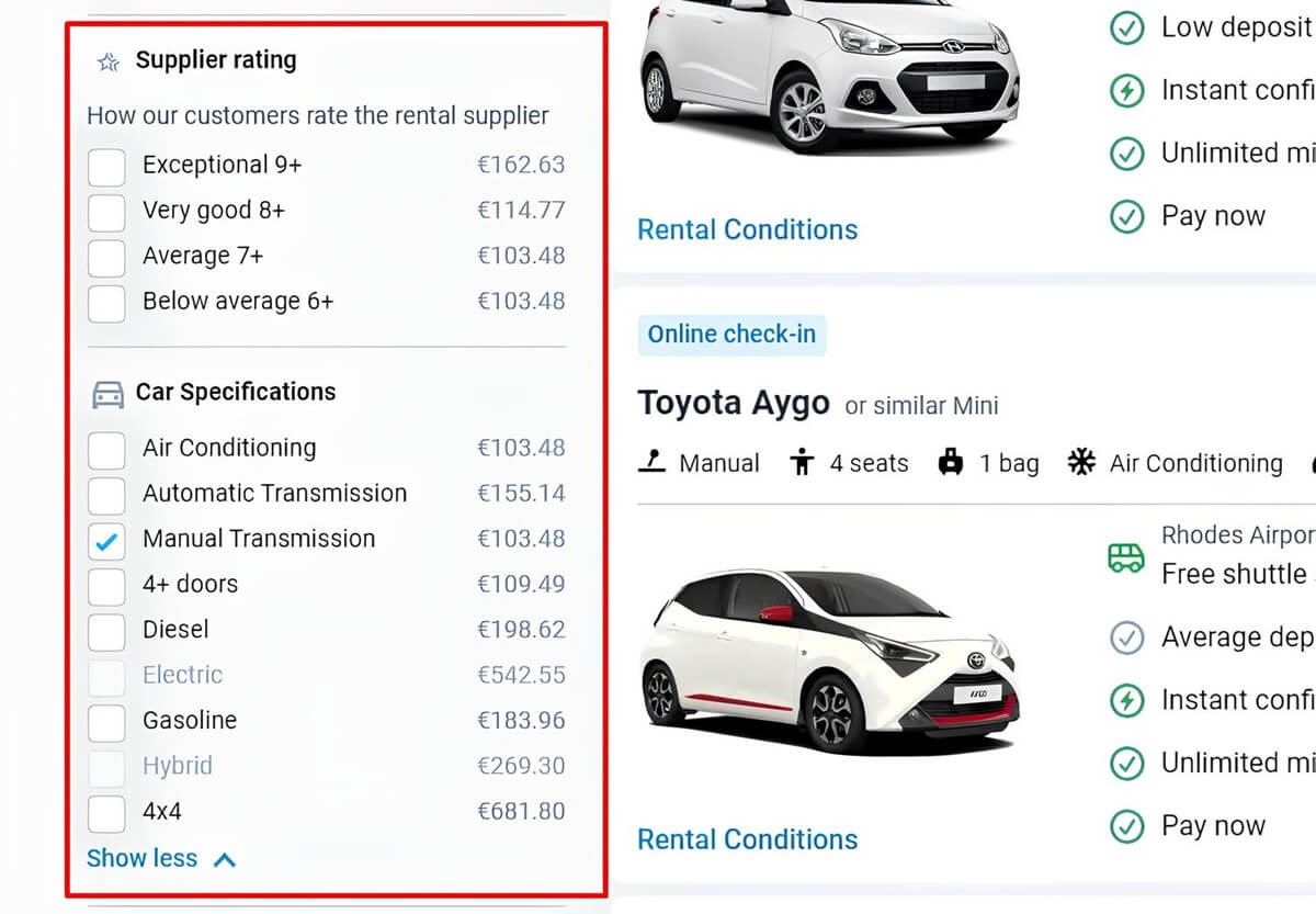 + Minimaler Dokumentenaufwand bei der Buchung. Zwei von drei lokalen griechischen Autovermietern sind bereit, Ihnen ein Auto ohne Anzahlung und ohne Angabe Ihrer Bankkartendaten zu reservieren (dies gilt auch im Jahr 2023). Um Ihre Absicht, ein Auto zu mieten, formell zu bestätigen, können Sie eine Kopie Ihrer Flugtickets/Hotelreservierung senden.