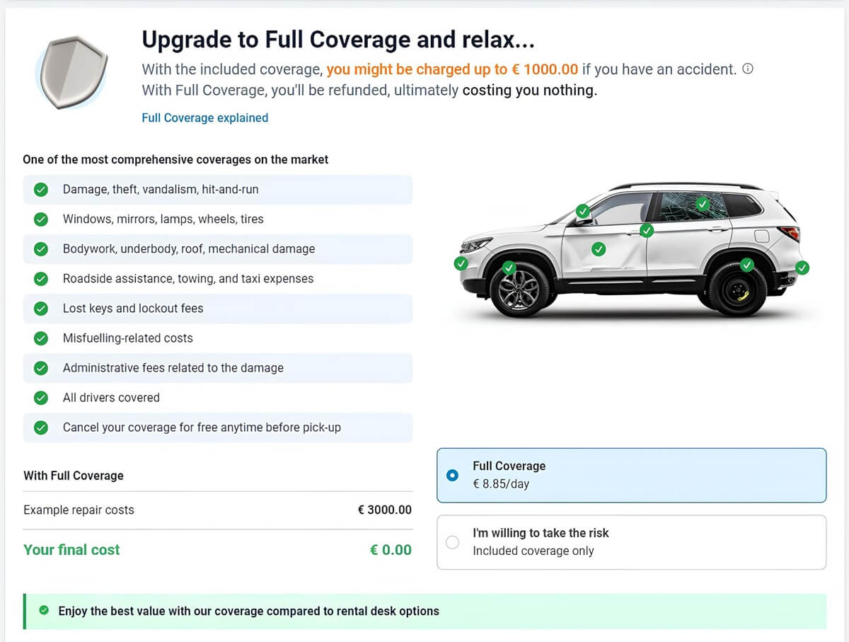 Dagegen bietet DiscoverCars eine eigene Versicherung – “Vollschutz”, die vorteilhafter ist als ähnliche Angebote lokaler Autovermietungen, Schutz für Glas, Reifen und Unterboden des Fahrzeugs abdeckt und null Selbstbeteiligung hat. Zum Beispiel kostet “Vollschutz” für Fiat Panda oder ein ähnliches Auto dieser Klasse im Juni 2026 7,88 Euro pro Tag bei Miete ab einer Woche.