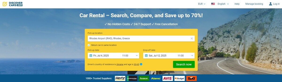 Discovercars – für mich ist das derzeit die beste Option. Denn in der Regel sind die Mietwagenpreise in Griechenland auf dieser Website am günstigsten. Im Preis sind bereits alle obligatorischen Versicherungen und oft auch zusätzliche Optionen (z. B. ein zweiter Fahrer kostenlos) enthalten.